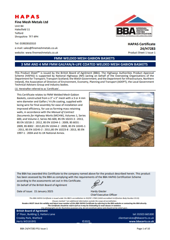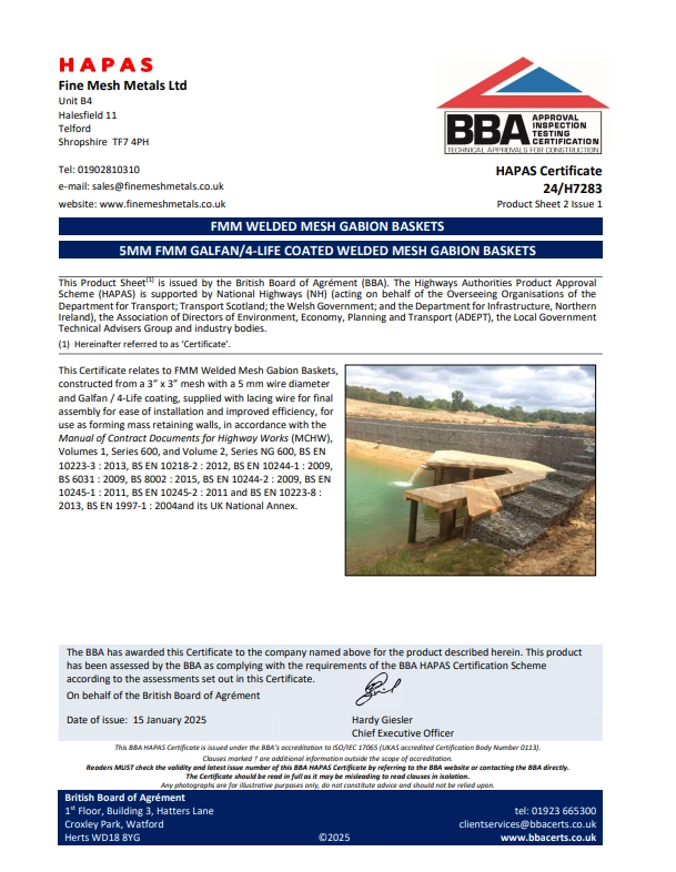 Fine Mesh Metals Ltd’s FMM Welded Mesh Gabion Baskets have been rigorously tested and certified by the British Board of Agrément (BBA) under the Highways Authorities Product Approval Scheme (HAPAS). These certifications confirm the durability, strength, and compliance of our 3 mm, 4 mm, and 5 mm Galfan/4-Life coated welded mesh gabion baskets, making them suitable for mass retaining walls, erosion control, and highway infrastructure projects. Below, you’ll find detailed BBA HAPAS certificates for each product variant, outlining technical specifications, performance assessments, and installation guidelines to assist engineers, contractors, and decision-makers in selecting the right solution for their projects.